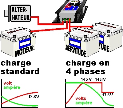 L'idéal est de séparer complètement les circuits de charge. L'alternateur moteur d'origine (généralement faiblard) s'occupe de la batterie démarrage. Les batteries de service sont chargées par un second alternateur plus puissant. On peut monter allègrement un 100A avec un banc de 400Ah. On fait Ampères à part et on dispose de deux alternateurs pour parer aux pannes. C'est mieux en Grand Voyage.