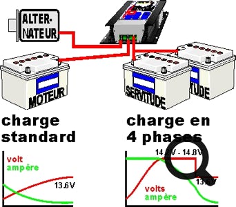 Beaucoup de bateaux utilisent l'alternateur d'origine du moteur de propulsion et un répartiteur de charge. Cet accessoire permet d'orienter plus ou moins d'Ampères vers les batteries de service ou celle de démarrage. Méfiance ! Si vous souhaitez utiliser un tel accessoire, il faut choisir un modèle pratiquement sans perte de tension (pas à diodes). CRISTEC en propose ainsi que quelques autres fabricants (Victron, Sterling). Sinon, vous ne remplirez jamais vos batteries.