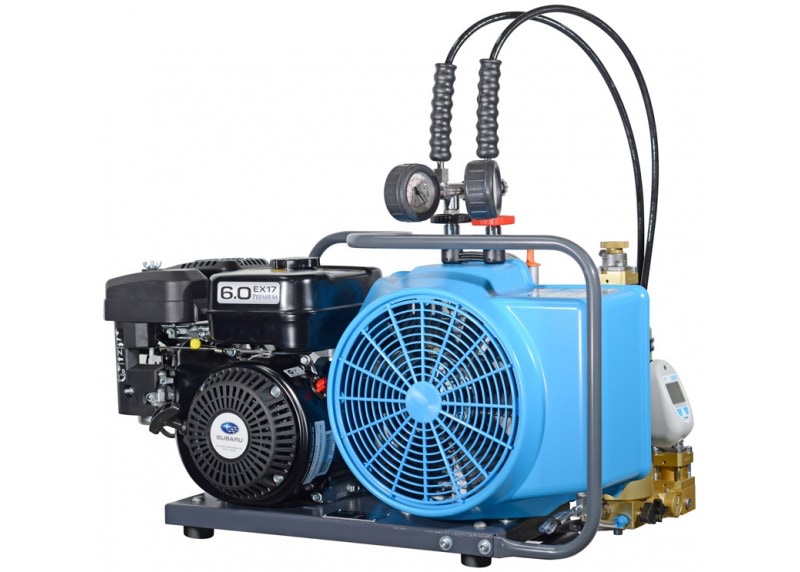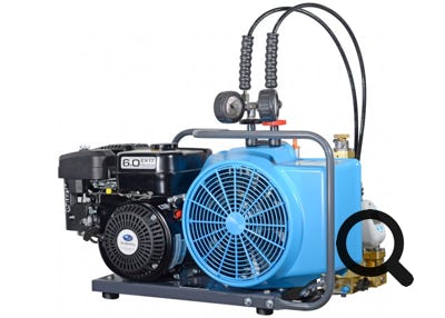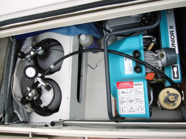 Le compresseur électrique Bauer gonfle une bouteille calée dans son râtelier.