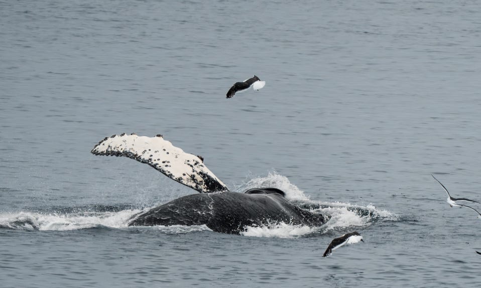 Durant mes périples, si j’ai vu plusieurs espèces de delphinidés, il me semble n’avoir jamais rencontré qu’une deux espèces de baleine : la baleine à bosse en Atlantique et Antarctique et le rorqual commun en Méditerranée.
