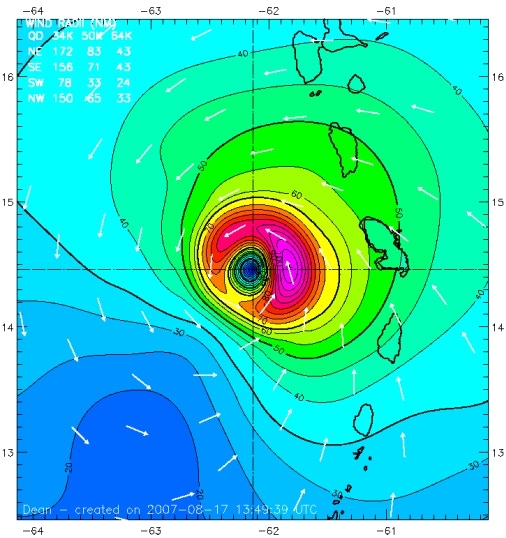 Cyclone Dean, champs des vents le 17/08/2007 à 13:30 GMT.