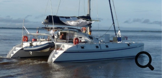 Nous avons placé un passe coque au centre équipé d'un tuyau souple qui rejoint la nable de remplissage du tank. La GV est condamnée, ce qui n'est pas important sur les fleuves. Il faut attendre que le grain de vent passe et cède la place à la pluie drue pour ouvrir la bâche et en avant les flots. Il vaut mieux "aider" la bâche et de plus c'est amusant. Notre record est de 220 litres en une averse. Veiller à fermer la nable si l'on n'est pas sur le point de recevoir de la pluie, des insectes ou des rongeurs peuvent se perdre dans le tank et contaminer l'eau (dengue, et pire si rongeur crevé …).