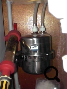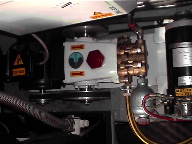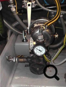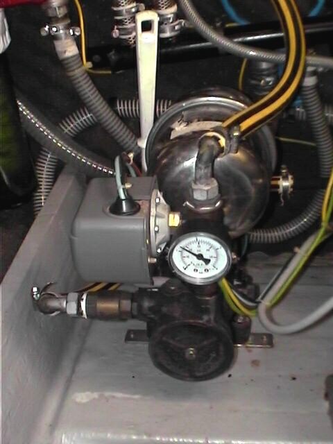 J'ai fait connaissance sur Caramel d'un type de pompe (marque FEIT chez REYA) que je ne connaissais pas et à l'usage est fiable et durable : la pompe à ailette de bronze, (le même genre que la pompe à eau douce de nos moteurs diesel). Pas d'usure de rouet. Le contacteur de pression est d'un type industriel. Le circuit est maintenu sous pression grâce à 2 ballons d'expansion au lieu d'un, ce qui assure une plus grande souplesse d'utilisation et préserve la pompe et le pressostat de démarrages-arrêts trop nombreux. En prime, cela diminue un chouia la consommation électrique. Je trouve ce système meilleur que les pompes classiques à membranes (genre PAR-Jabsco) qui sont nettement plus fragiles (membranes et contacteur du pressostat).
