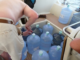 Sur un bateau de série qui a 300 litres d'eau, une transat à 4 équipiers durant 15 jours autorisera une consommation de 5 litres/pers/jour. Cette quantité se retrouvait sur certains bateaux du rallye des îles du soleil, mais tous emportaient au moins 100 litres en bidons et avaient la consommation contrôlée drastiquement. Une quantité de 500 litres est le minimum sur un bateau de voyage. Plus le bateau sera grand, plus il pourra transporter sans peine un volume important d'eau. Nous avons plus de 1000 litres avec nous. Au delà des 500 litres, la réserve d'eau est destinée au confort.