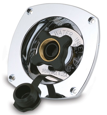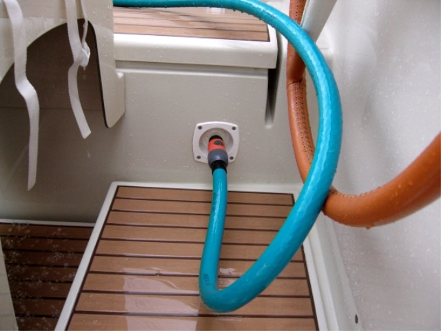 une prise d'eau de cockpit (OSCULATI par exemple). Facile à placer, elle contient un réducteur de pression, qui protège le circuit du bord et un embout type Gardena qui se visse dessus. A placer plutôt verticalement.