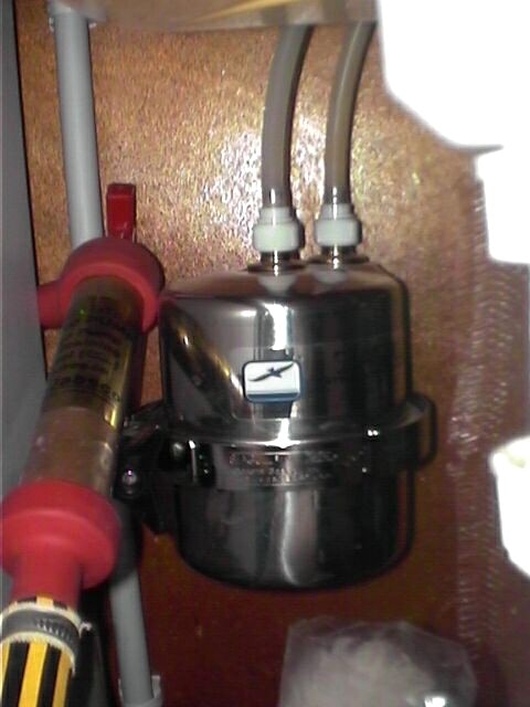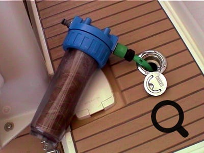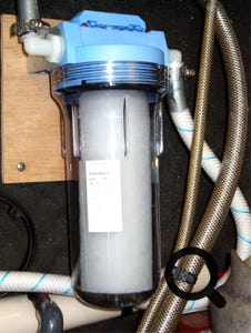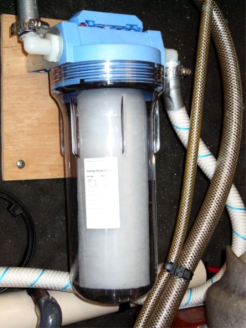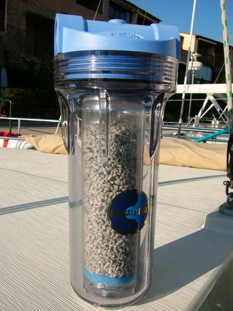 Bibine TRUC : j'ai également pris l'habitude de filtrer l'eau de ville dont je remplis les tanks au travers d'un filtre à cartouche de 5 microns que l'on trouve pour peu cher dans les bricos. J'ai pris le même modèle que le pré-filtre du dessalinisateur, je n'ai donc qu'un seul modèle de cartouche de remplacement. On est surpris à l'usage de voir la couleur que prend le filtre, donc des impuretés retenues. Bref j'essaye de ne pas mettre de cochonneries dans les tanks pour les garder propres (c'est pas marrant à nettoyer et toujours difficile).