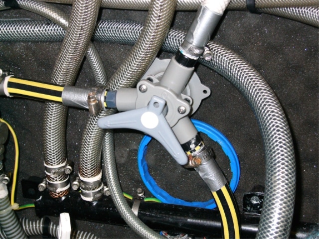 Alimentation directe en eau du quai par une prise de cockpit et réducteur de pression.