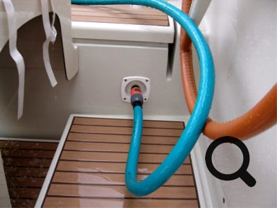 Douche de pont TRUC : nous avons modifié la pomme de douche de pont pour la rendre amovible et compatible avec le système GARDENA. Ceci nous permet de brancher un tuyau d'arrosage pour laver le pont en cas de besoin (hyper salé ou hyper cochonné comme en ressortant nos deux ancres de la boue noire grasse et collante du port d'Essaouira au Maroc). Nous utilisons alors un petit nettoyeur haute pression KARCHER qui ôte sel et boues gluantes en consommant bien moins d'eau et de temps.