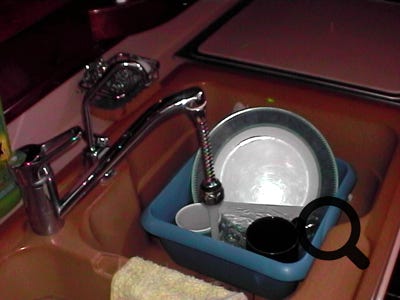 robinet à pompe manuelle, douche à l'eau de mer et rinçage à l'eau douce mais avec un pulvérisateur, se raser dans un verre, robinet d'eau de mer à la cuisine qui permet une vaisselle à l'eau salée et un rinçage à l'eau douce (mais attention, l'eau de mer est agressive pour tout ce qu'elle touche, il faut bien tout rincer), etc…