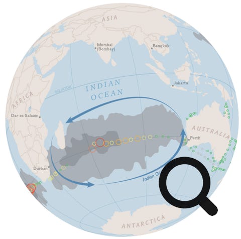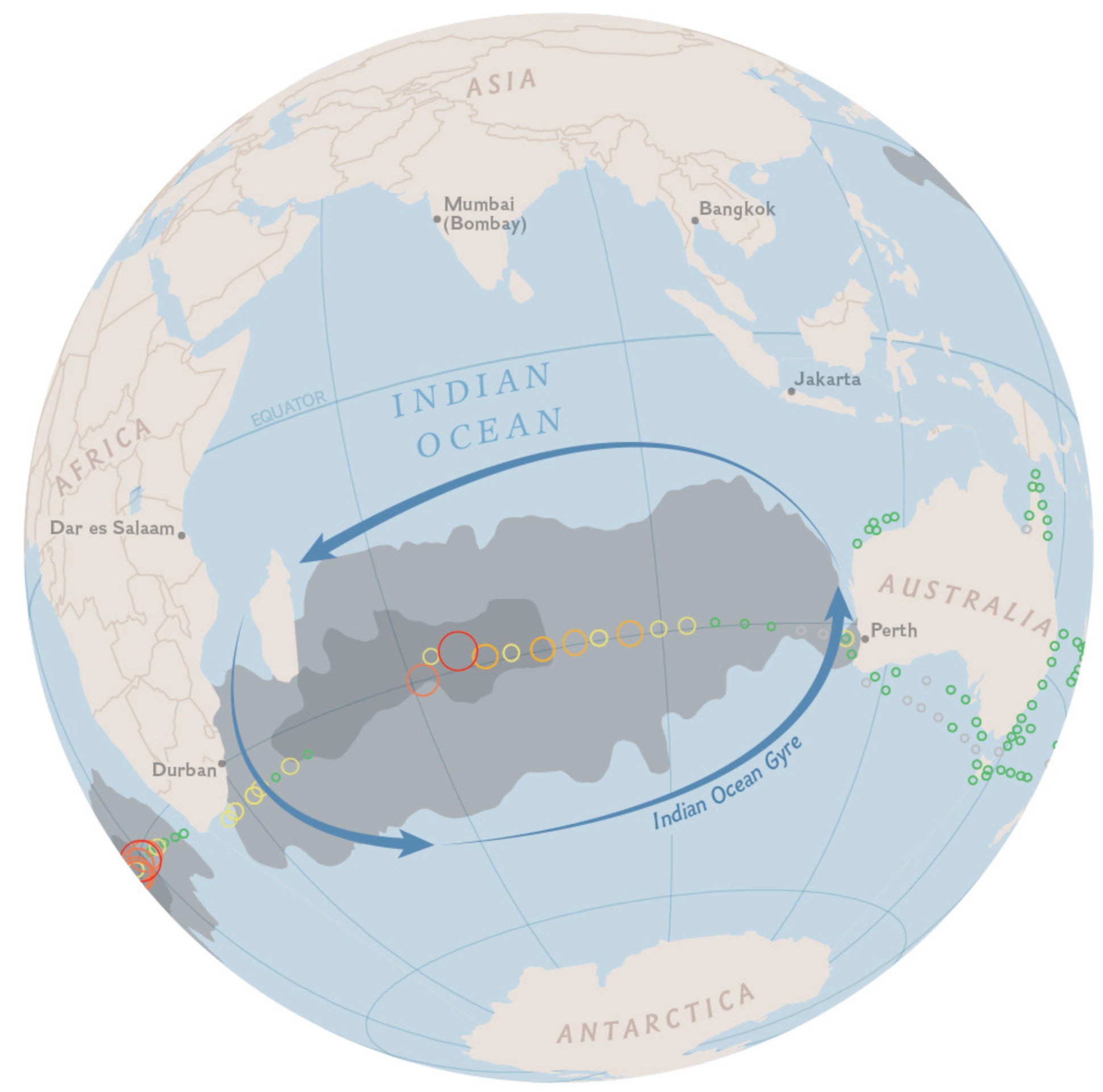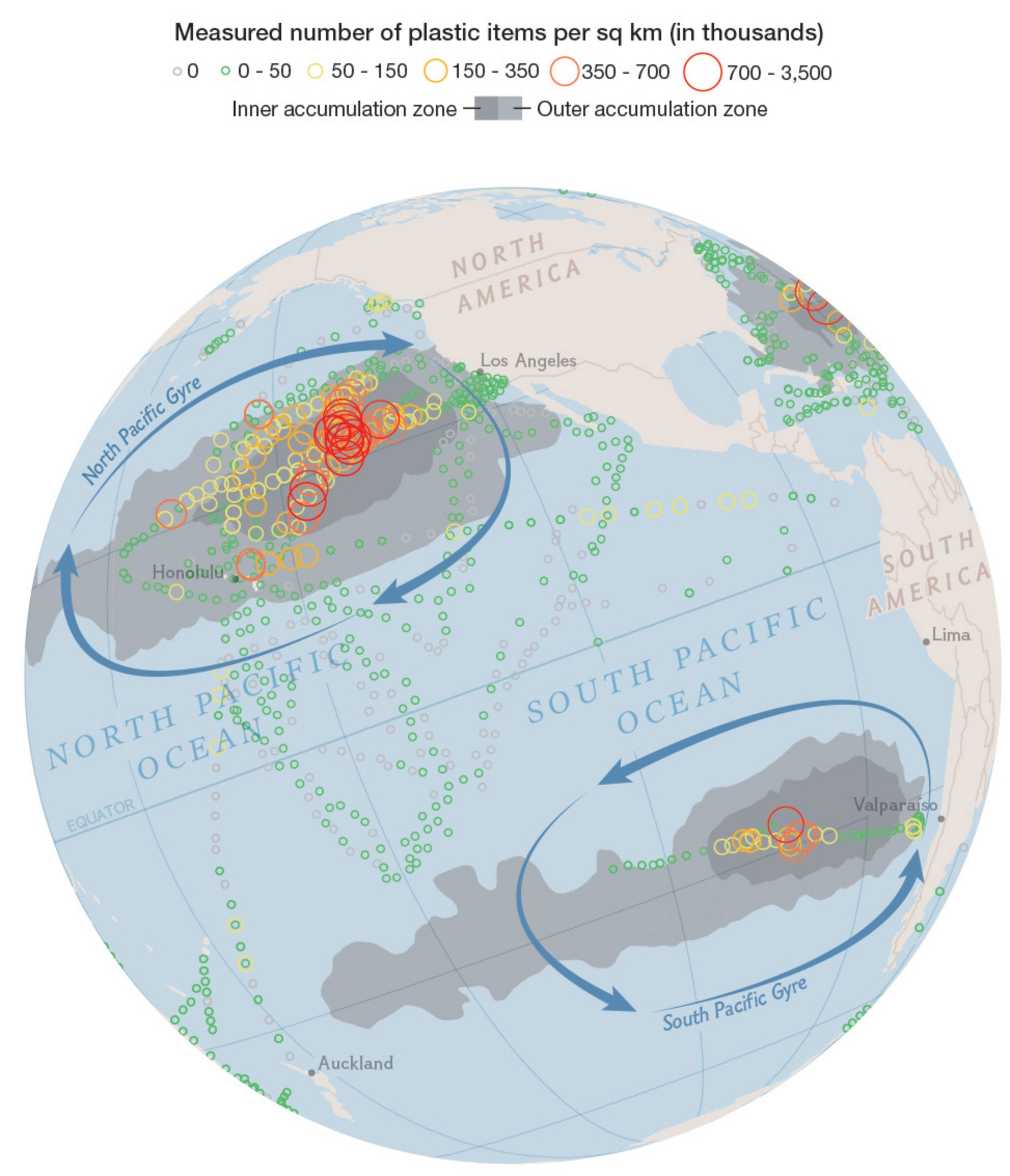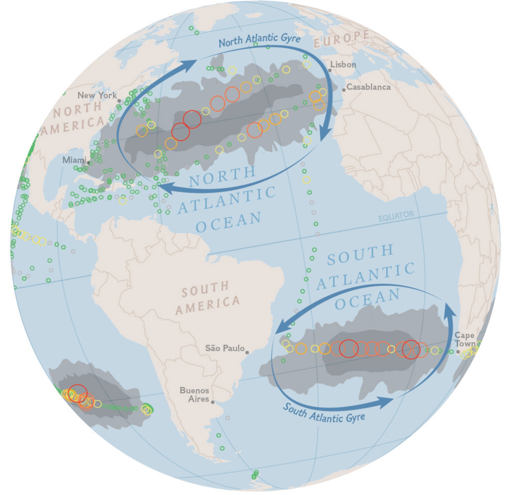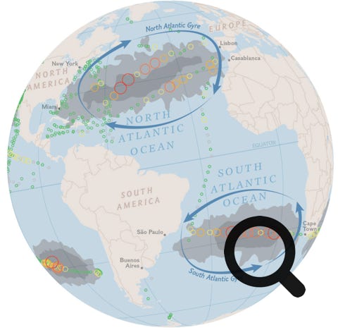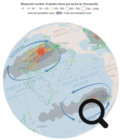 Tous les océans sont concernés : Pacifique sud, Océan indien, Atlantique nord, Atlantique sud. En voici les traces avec les concentrations de plastiques :