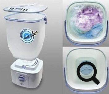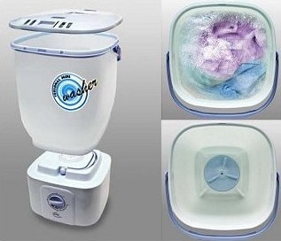 Le type c est issu du camping. Scrubba wash bag est un sac étanche tapissé à l’intérieur de petits doigts massants. C’est léger, c’est pour les petites lessives, ça fonctionne et c’est facile. Vidéo de démo. Plusieurs modèles.