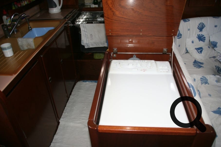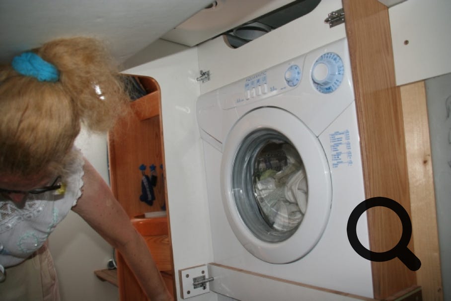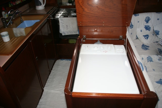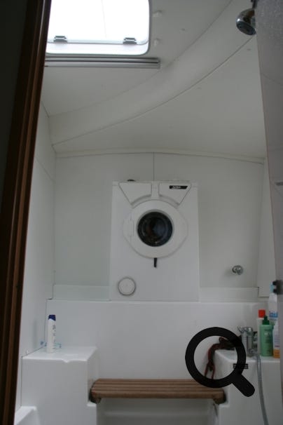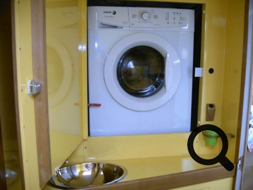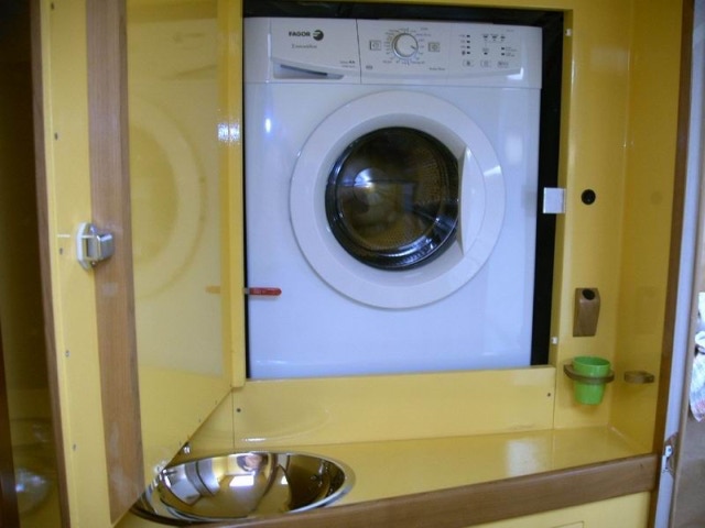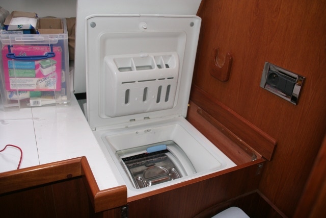 Si votre bateau fait plus de 18 mètres, vous aurez droit à une buanderie, sinon comme 99,5% d’entre-nous, vous devrez lui trouver une place dans les aménagements classiques. En faisant ma petite enquête, j’ai observé que la plupart des lave-linges trouvent une place dans une cabine transformée ou plus rarement dans une salle d’eau. Quelque fois, on arrive à le placer dans une cale technique, mais avec une accessibilité réduite.