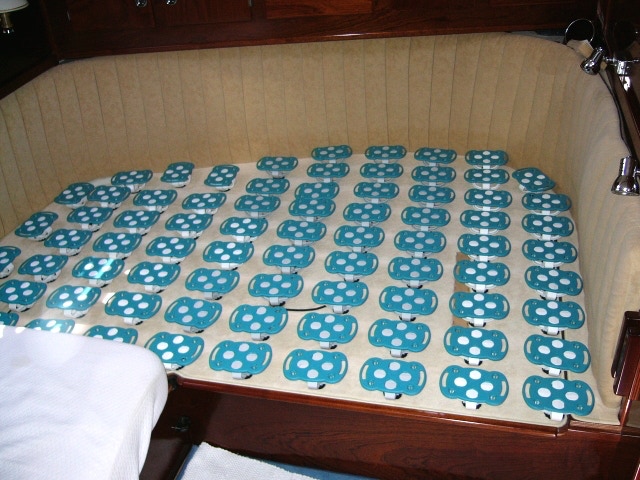 Nettement mieux : la paillasse de fils tressés. Se vend chez tous les shipchandlers, épaisseur 2 à 3 cm, se découpe facilement, l'air circule sous le matelas. Faire remonter entre coque et matelas pour une bonne circulation d’air. Nous l’avons installé avec succès dans notre dernier bateau.