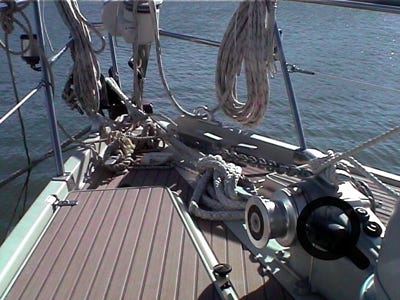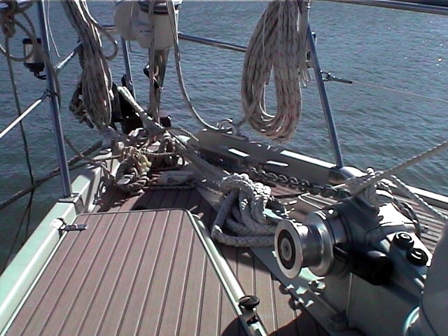 Plage avant très encombrée dans un port foireux : 2 corps-morts trop proches et une ancre au milieu du bassin !