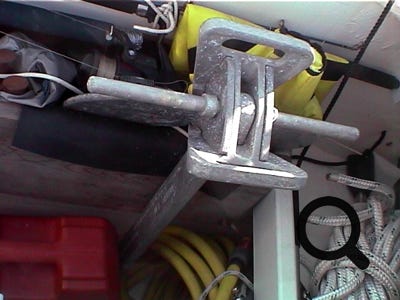 Davier d'étrave - Commentaires : le constructeur l'a conçu de telle sorte que l'ancre tombe seule dès qu'on lâche de la chaîne. Elle se repositionne seule dans le davier à la remontée. Mais je n'aime pas cette opération qui est parfois brutale pour le matériel et je remonte toujours l'ancre à la main dès qu'elle est en cravate. L'ancre est bloquée sur son davier avec un bout muni d'un coinceur. Eviter à tout prix de bloquer l'ancre en tendant la chaîne avec le guindeau, cela démolit l'axe d'entraînement de celui-ci. La partie gauche du davier est dans l'axe de la poupée cordage du guideau et est équipée de 3 rouleaux qui forment un "U" : un horizontal et 2 verticaux. Cela permet d'exercer une forte traction, même sur un câblot qui n'est pas dans l'axe du bateau.