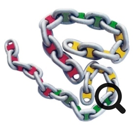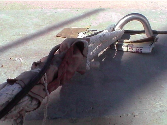 100 m Chaîne de 10 mm en acier galvanisé - Commentaires : bonne longueur, permet de voir venir, la résistance est suffisante. La chaîne et l'ancre perdent leur galvanisation dans l'eau douce et acide de certains fleuves tropicaux. On peut trouver de la chaîne inox de qualité à Trinidad (ECHO-MARINE), mais c'est devenu très cher et la résistance au même diamètre est inférieure à l'acier galva. Nous mouillons toujours un minimum de 25 m, puis rallonge suivant les circonstances. Je n'ai pas mis d'émerillon entre la chaîne et l'ancre (pas confiance, mais j'ai peut-être tort), mais une simple manille lyre inox , avec manillon pour clé hexagonale et 2 points de soudure pour le sécuriser contre le vol. C'est surtout valable si vous avez une belle ancre inox qui fait des envieux chez les antillais ... En France : chaînes VIGOUROUX.