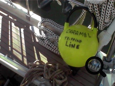 1 Touline - Commentaires : c'est à dire un lance amarre. Longueur 20 m, ce qui est largement suffisant. Une extrémité est terminée par une pomme de touline dont la confection occupera une soirée d'hiver. Celle de Caramel est lestée avec une balle de golf, qui a le diamètre adéquat. Un lecteur nous indique qu'il a utilisé du bout flottant (polypropylène) avec un anneau de caoutchouc en bout de ligne (genre jeu de plage ou deck tennis). Si le destinataire rate l'envoi, il y a plus de chance de rattraper le bout qu'avec une extrémité plombée. Malin !