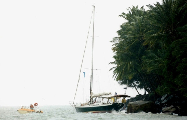 Cayenne, un groupe de 5 bateaux décide de s'arrêter aux îles du Salut, pour passer la nuit et visiter les ruines du bagne. Dans la baie, la mer est calme, le vent est faible, les bateaux ancrent et tous partent en annexe pour une excursion de 2 à 3 heures. Une heure après le débarquement, un grain arrive. Le ciel est noir, le vent souffle rapidement à 40 noeuds. Les équipages reviennent en catastrophe vers les bateaux. Trop tard, "Captain Smith" est déjà sur les rochers. Il tosse durement et sa coque en alu gémit à chaque branlement provoqué par les vagues. Gérard et deux camarades foncent en annexe sur le bateau qui accuse une forte gîte sur tribord. Le moteur démarre, le gouvernail répond toujours, mais le navire blessé reste cloué sur son flanc. Il faudra l'intervention d'un autre voilier du groupe pour le dégager, en le halant avec une très longue amarre (100 m) capelée sur une drisse en tête de mât. Le couple est suffisant pour coucher un peu plus Captain Smith qui se déhale hors des rochers. Le choc psychologique est profond mais le bateau était solide et bien construit (META, merci Mr.Fricaud). Pas une voie d'eau, le safran est tordu mais efficace. Il rejoindra Trinidad par ses propres moyens pour une longue et spectaculaire convalescence de ses 14 enfoncements.