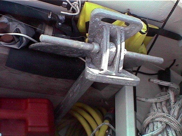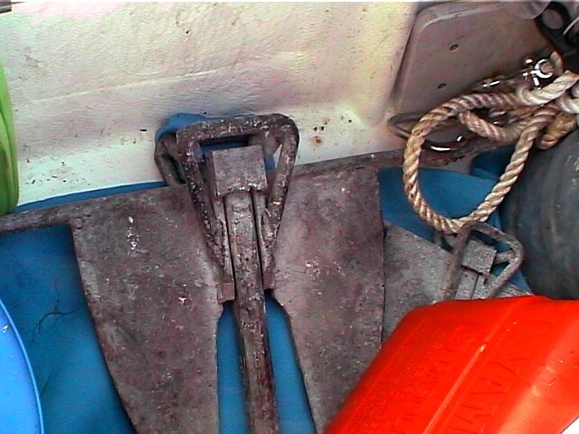 1 Ancre plateFOB HP 20 kg en acier galvanisé - Commentaires : un chouia sous dimensionné comme ancre principale mais encore manipulable à la main comme secondaire. A ce propos, pratiquement tous les voiliers américains et canadiens ont deux ancres à l'étrave, et des daviers étudiés à cet effet. Faisant partie de l'autre grande famille des ancres (plates), elle complète bien l'ancre principale (soc). Elle se range facilement à plat dans un coffre avant, sur un douillet lit de mousse pour éviter de faire du bruit et de riper. Elle a toujours bien croché, elle est rustique et costaude.