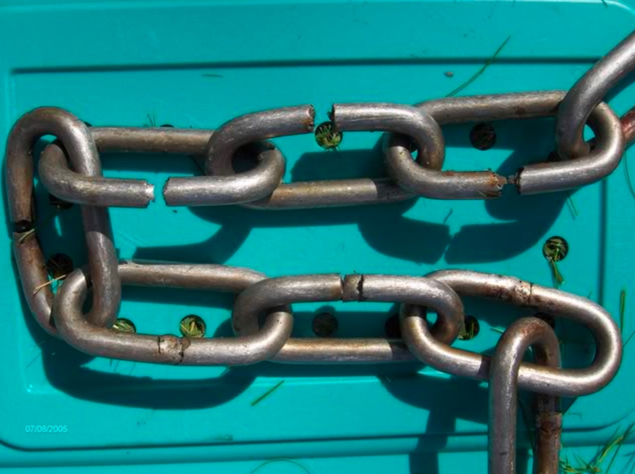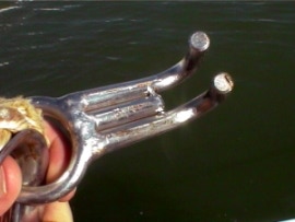 Crochet de chaîne - Commentaires : double croc de SWI-TEC ou simple monté sur un gros bout nylon très souple de 8 m. Un mètre après le crochet, j'ai monté un gros amortisseur d'amarrage en caoutchouc qui augmente l'élasticité du mouillage. Si le clapot est fort, je sors la totalité du bout. La chaîne est détendue au guindeau pour reprendre la traction seulement sur le bout. Diminue le bruit au mouillage dans la cabine avant. Notre crochet double SWI-TEC s'était désoudé suite à un coup de vent de seulement 40 noeuds. Le fabricant l'a remplacé sans sourciller après 3 ans, par un nouveau modèle renforcé qui ne devrait plus faiblir. Bravo le service !