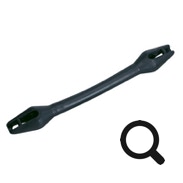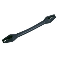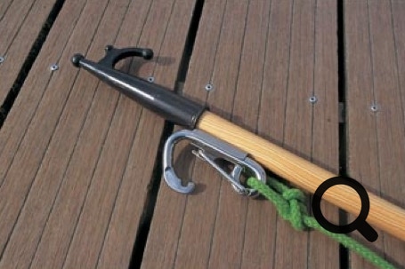 Mousqueton géant - Commentaires : au bout d'un cordage. Se grée sur l'extrémité de la gaffe pour crocher un corps mort. L'étrave devient trop haute pour passer un bout couché à plat pont. Ce petit accessoire me permet également de prendre un corps-mort en solitaire, avec de bonnes chances de réussite. Une fois le mousqueton croché, le bateau est assuré et on peut prendre son temps pour aller passer un bout avec l'annexe si nécessaire.