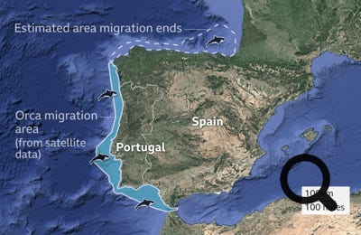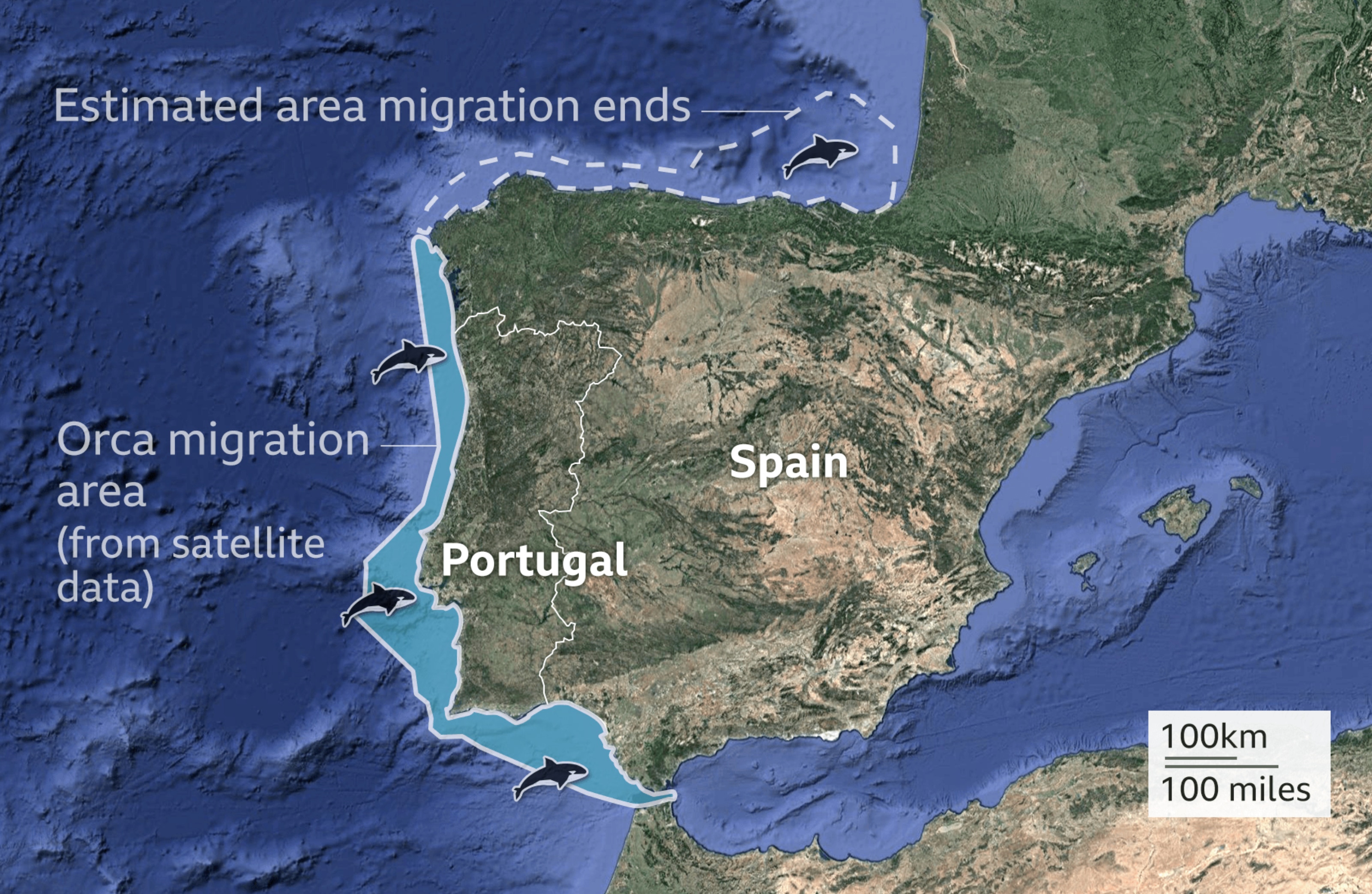 Carte 2022 des zones ibériques où des interactions avec des orques sont possible