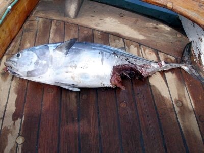 La remontée du poisson est aussitôt reprise. Mais, surprise, la traction est bien molle, le bestiau ne se défend-il plus ? Le bas de ligne arrive à bord avec pour tout trophée, une tête de dorade coryphène sanguignolante. Tout le corps vient de se faire avaler par un requin.