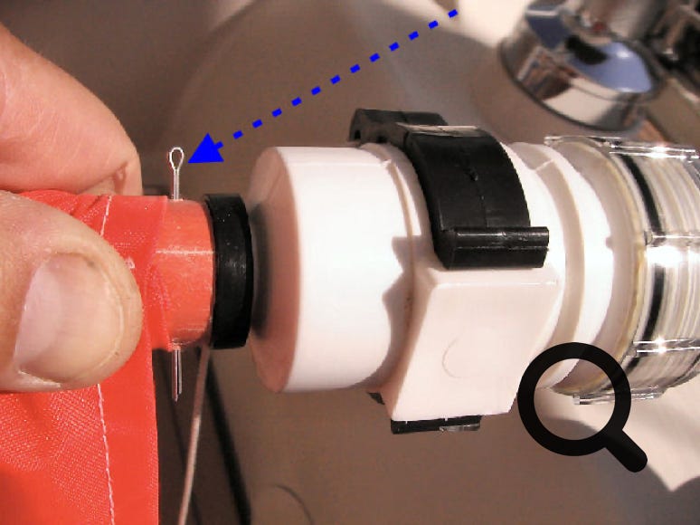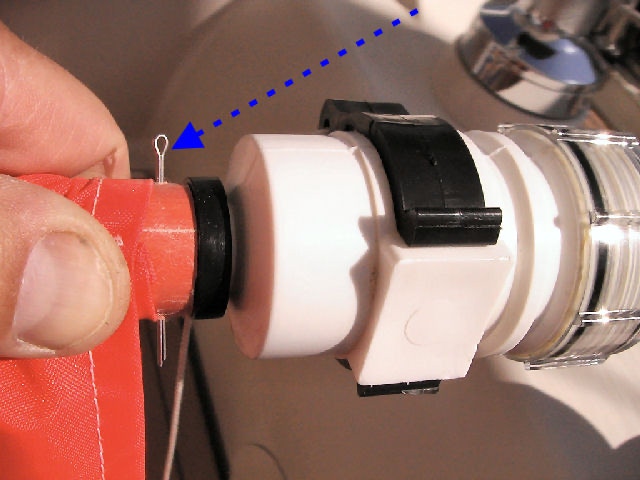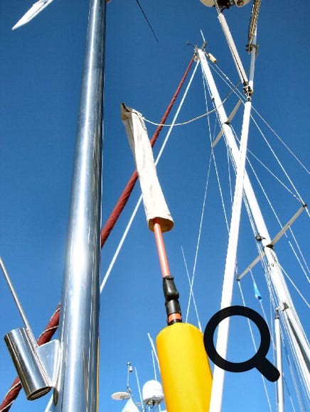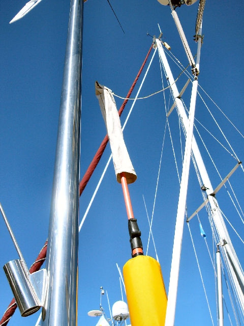 Pour protéger le fanion des UV destructeurs, je préconise l'utilisation d'un étui. Celui-ci doit être bien large pour s'ôter facilement. On peut attacher l'étui au bateau avec un fin bout pour qu'il s'enlève automatiquement lorsque la perche est jetée à la mer. Sans cela, le fanion orange en nylon ne vivra que 6 mois sous les tropiques .