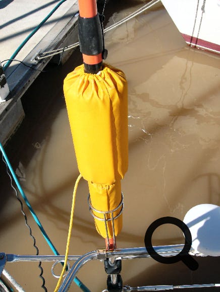 Sur la précédente perche IOR, les UV ont craquelé les flotteurs. J'ai fait des petites housses en tissu enduit jaune qui protègent ceux-ci. La bouée «fer à cheval» a tout autant souffert des UV.