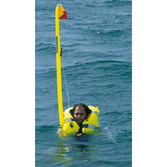 J’ai utilisé l’ensemble une seule fois pour repêcher de jour le naufragé d'un autre bateau, la perche IOR et la bouée forment un groupe flottant remarquable et peu sensible au vent. A 100 m, le drapeau était bien visible sur l'eau.
