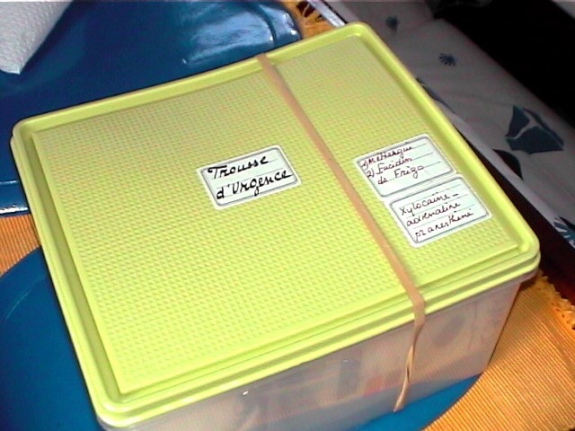 Cette trousse est empaquetée dans une boite étanche, facilement accessible dans une armoire du carré. Les équipiers sont censés savoir où elle est. Certains ont même regardé ce qu'elle contenait. On y trouve les médications et les accessoires pour les situations où il faut réagir rapidement (saignements, douleurs, insectes, cardio par exemple). Plusieurs produits sont dangereux et ne peuvent être utilisés sans autorisation médicale. Nous verrons plus loin comment accéder au diagnostic médical au large ou dans des endroits tellement paumés qu'il faudra plusieurs jours avant de trouver un médecin (notamment les fleuves tropicaux).