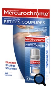 C'est un pansement liquide à inviter à bord. Il peut être appliqué sur les petites plaies qui guérissent difficilement (sel, humidité, bains). Son application stoppe les petits saignements et rend la plaie imperméable à l'eau tout en la laissant respirer. Le film s'élimine naturellement après quelques jours. En vente en (para)pharmacie.
