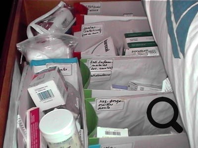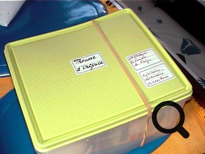 Pour gagner de la place, retirer les plaquettes de médicaments encapsulés hors des emballages cartonnés et glisser les dans des sachets plastiques transparents avec fermeture étanche (type Ziploc). Y joindre la notice, où l'on aura préalablement surligné en jaune les points importants (nom, molécule active, posologie).