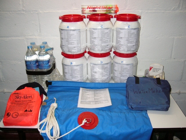N'oubliez surtout pas la trousse du radeau de survie. Anxiété, humidité, soleil sont quelques uns des dangers contre lesquels il n'y a rien de prévu dans le précieux container blanc et vous allez peut-être y passer plusieurs jours.