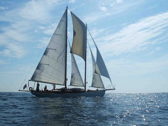 L'objet de tous ses désirs est une construction de 1934 tout en bois massif, dessinée par Ellis Brother un architecte en vogue de Southgate (Los Angeles). Un long couloir lesté comme le veut la définition, avec un joli gréement de goélette très effilé. La coque de 44 pieds est prolongée à l'avant par un immense beaupré. Une longue queue de malet porte la longueur de l'ensemble à 60 pieds!