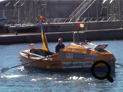 Depuis notre arrivée, Théodore Resnoy, ukrainien de son état prépare son bateau pour une traversée de l'Atlantique à la rame, nous venons lui rendre visite plusieurs fois et lui offrir un paquet d'abricots séchés. Le jour de son départ toute la marina lui fait un concert de hourras et de corne de brume. Vraiment émouvant de voir ce grand costaud blond tirer sur ces avirons avec les larmes aux yeux. Bonne chance à toi aussi Théo, tu n'as pas choisi la voie la plus facile. Quel cran, chapeau bas.