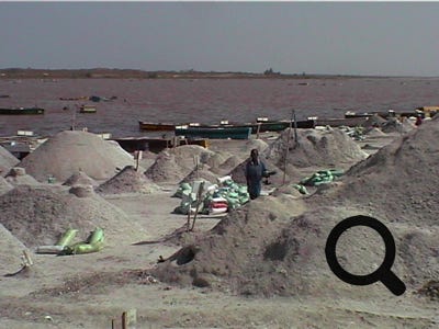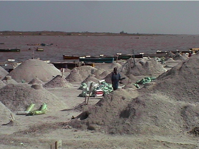 Départ pour une excursion vers le Lac Rose en camion 4 x 4. Le groupe de trois camions nous balade autour de ce lac d'eau de mer aux reflets rosés. Les sauniers font un dur métier. Ce sont des maliens (du Mali…) qui sont invités à le faire. Le sol de ce lac peu profond est couvert d'une croûte épaisse de sel qu'ils brisent avec un pieu de bois, puis ils plongent pour ramasser les morceaux détachés, en chargent leur pirogue et ramènent le tout sur la berge où les femmes font des monticules. Le sel ramassé est noir et devient gris après quelques jours au soleil. La peau des travailleurs se ratatine dans ce lac hyper salé. Ils ne travaillent pas plus de deux ou trois ans au terme desquels ils sont cuits par le sel. Dur labeur sous cette chaleur.