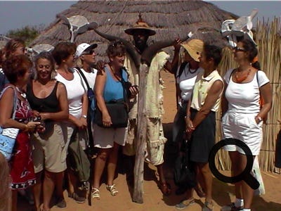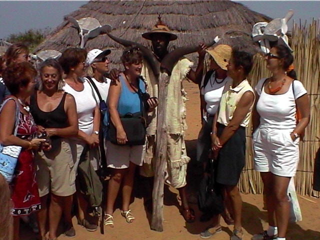 Nous visitons ensemble par le ferry boat, la petite île de Gorée à quelques milles au large. La légende veut que ce soit le lieu de rassemblement du "bois d'ébène" (les esclaves africains) avant l'embarquement vers le Nouveau Monde, mais c'est passablement faux et ce n'est qu'un piège à touristes, joli du reste mais un piège tout de même. Nous y avons aimé les ruines de l'ancien palais du Gouverneur et l'activité des jeunes filles du marché qui nous interpellent dès la descente du ferry : «Ohé jolie Gazelle, viens avec ton Ministre des Finances chez Catherine Deneuve (c'est son nom de bataille)". Nous y sommes allés, Catherine a réussi à contenter la plupart des "actrices" en achetant colliers aux unes et bracelets aux autres mais Catherine Deneuve n'a pas aimé que Marie-Claire achète plus de bricoles chez sa concurrente Claudia Schiffer. Nous reprendrons le ferry avec des menaces de maraboutage sur des parties très privées de l'anatomie d'Alban.
