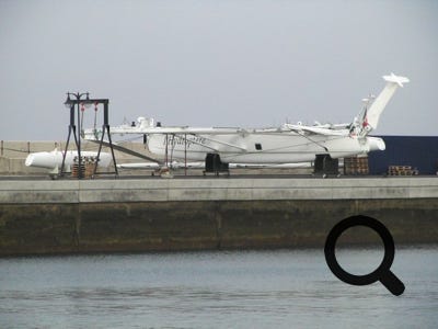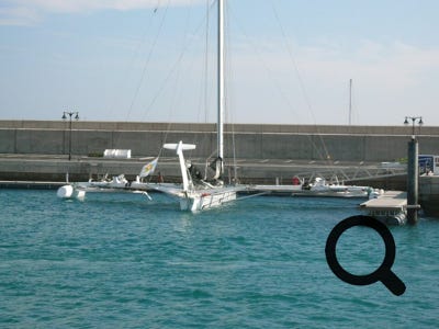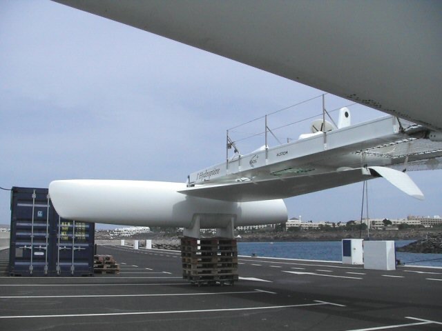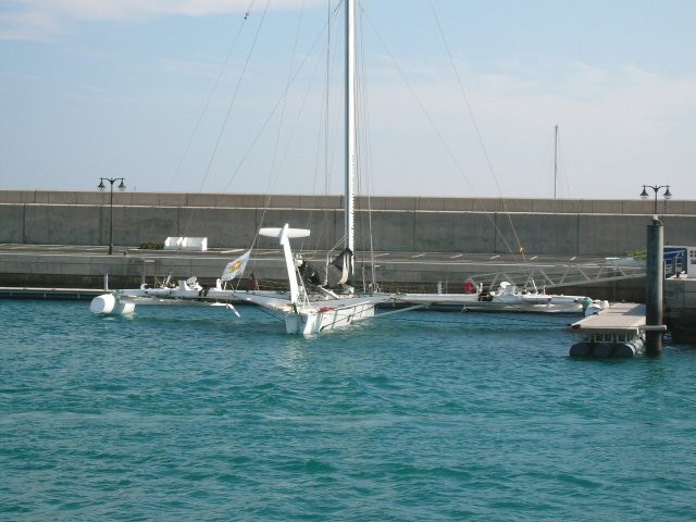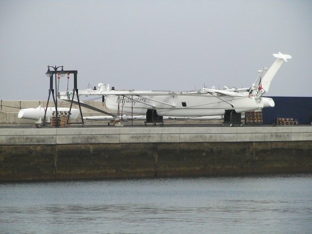 Toutes ces péripéties nous ayant pas mal occupé, je n'ai pas eu le temps de rendre visite à « l'Hydroptère » d'Alain Thébaud, amarré à l'entrée de la marina. Qu'est-ce que ce bateau de record, fait à cet endroit ? Je constate rapidement que le bateau n'est plus à l'eau mais a été gruté sur le quai. Plus large que longue, la bête est impressionnante, surtout avec son gouvernail relevé à la verticale. On dirait presque un vaisseau spatial.