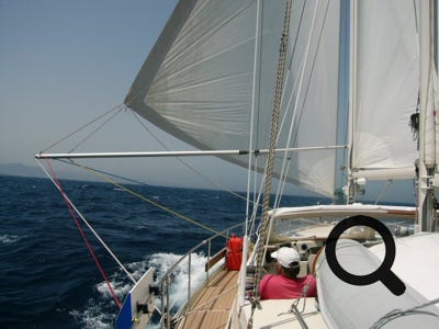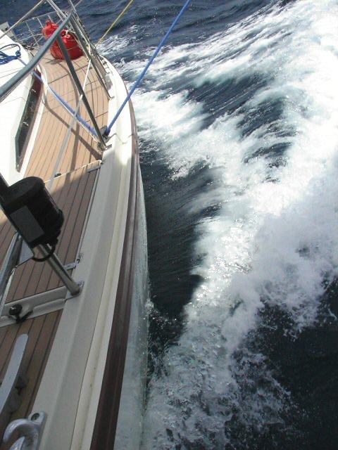 14 juillet, la France festoie. Nous aussi, c'est le vrai départ. Pas de cap à virer cette fois, c'est tout droit au sud. Minorque est à 300 milles. Un vent du sud trop léger nous impose de démarrer la brise Yanmar. C'est normal, c'est la Méditerranée. Trop ou pas assez, vous connaissez la chanson. Je n'ai jamais hésité à avancer au moteur, c'est toujours plus sympa que de tirer des bords par vent fort. Du moins, c'est mon avis. On peut pratiquer toutes sortes d'activités plutôt que de se tasser dans le cockpit dans un ciré malodorant.