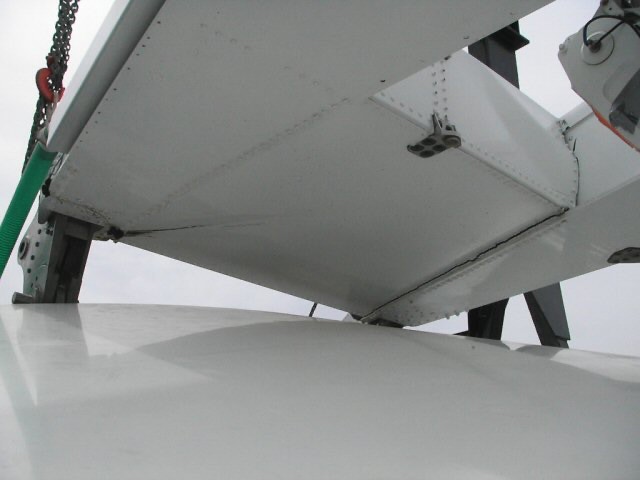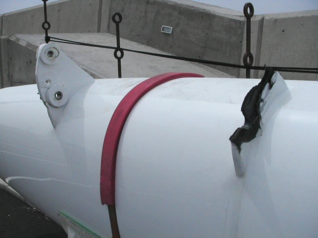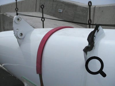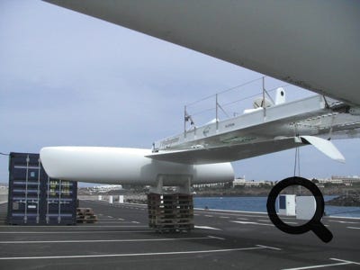 Je suis très gentiment reçu et visite le bateau. Lors de la récente tentative de record de traversée de l'Atlantique, le foil bâbord a heurté une tortue marine de belle taille. A 25 noeuds l'impact a été tel que le bout du bras en carbone s'est délaminé sur 50 cm , une des deux attaches du flotteur s'est arrachée et un fence du foil est broyé.