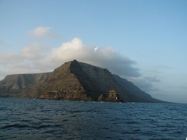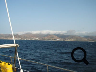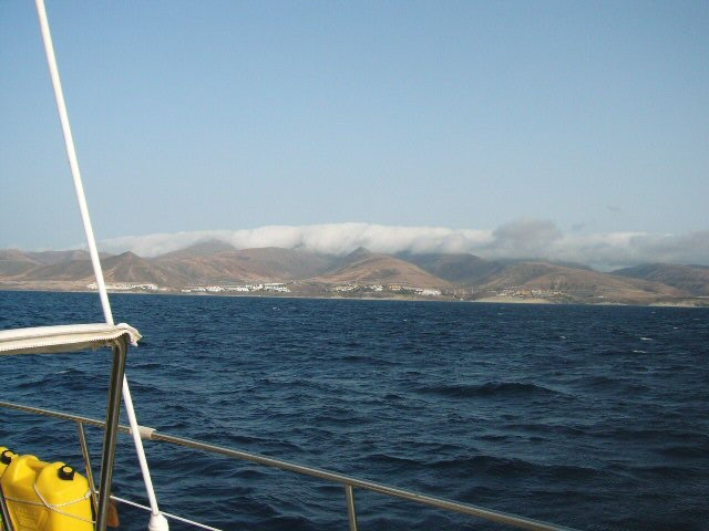 Le guide nautique nous apprend que le port sud de l'île (Moro Jable) est sujet à de fréquentes rafales de vent, surtout lorsque la montagne qui le surplombe est coiffée d'un chapeau nuageux. C'est le cas aujourd'hui et comme Caramel file bon train sous 20 nœuds de vent de travers, nous décidons de parcourir directement les 60 milles qui nous séparent de Gran Canaria.