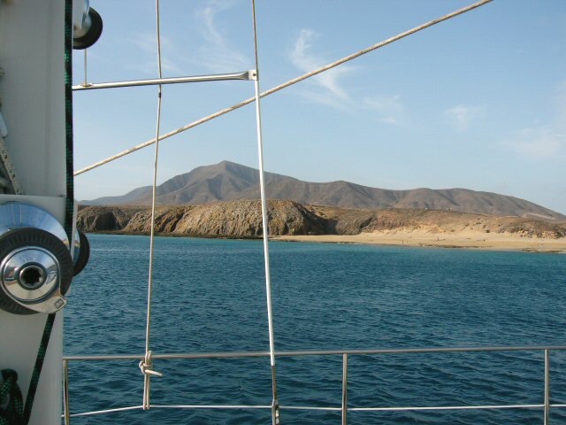 Après les montagnes volcaniques spectaculaires de la côte sud-est de Fuerteventura, nous faisons route à l'ouest, toutes voiles dehors. Caramel adore le petit largue (ce n'est pas très original). Il laboure les vagues en donnant de grandes claques d'écume. Nous filons entre 8 et 9 nœuds. La distance est vite parcourue.