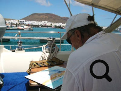 Jacques et Nicole ont fait fort. Ils n'ont jamais fait de bateau mais au hasard de vacances à Lanzarote, ils ont acheté une place de port ici, puis un bateau pour la garnir ! Jacques est très doué et apprend très vite. Garçon serviable et adorable, sa devise pourrait être : « Les ennuis de mes amis sont mes ennuis ».