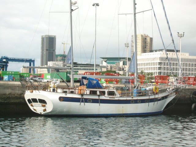Et ce n'est pas fini. Un épisode de "Dallas" s'est tourné le matin du 09 septembre. Escorteur militaire et hélico de la police tournant au-dessus du port, un ketch de 55 pieds du genre Choy Lee arrive en fanfare à couple d'un remorqueur. Le quai grouille de policiers. Le voilier nommé "Tobago Clipper" est amarré derrière notre place à quai. Si nous pouvons lire son nom, son port d'attache a été soigneusement repeint en blanc ! Sur le pont une série impressionnante de bidons de 100 litres, totalisant au moins 1200 litres ?! Bizarre, vous avez dit bizarre. Comme c'est bizarre.