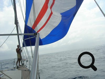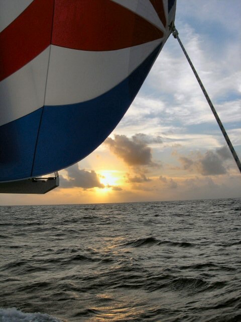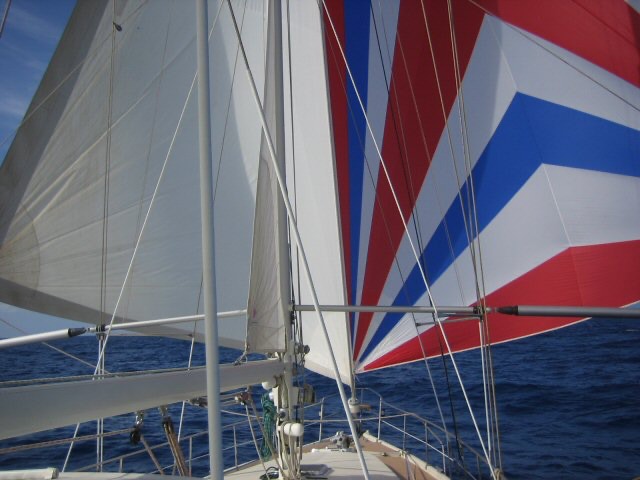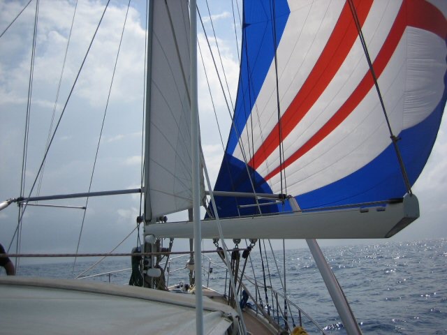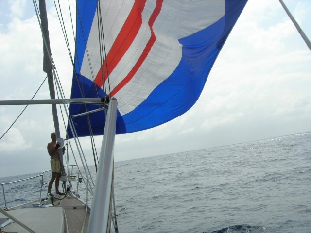 Toujours pas le moindre grain en vue, ni aux jumelles, ni au radar. Caramel est toujours aussi poussiéreux. La journée est active. Le vent donne un peu au sud et nous ne pouvons plus garder les voiles d'avant tangonnées. Le vent vient de travers, c'est le moment d'envoyer nos spinnakers, celui du grand mât et celui d'artimon.
