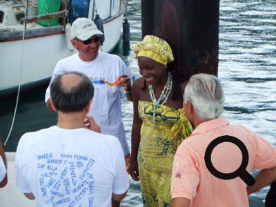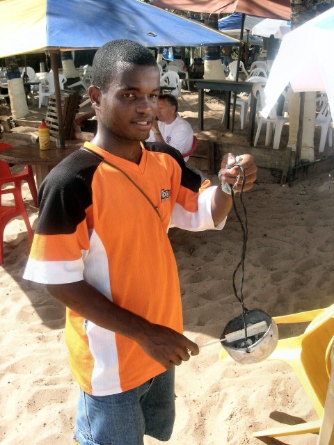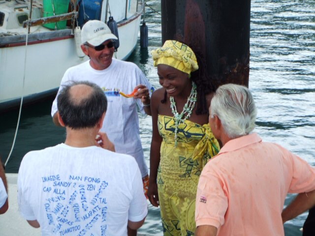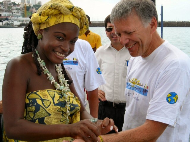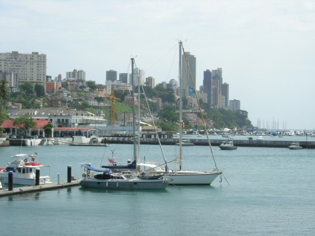 09h30 locale, l'accueil est pétaradant, à la brésilienne. Sur le quai, Philippe et Albert Brel, nous attendent an compagnie de représentants du Cercle Nautique et de Rosy en costume bahianais. Elle lie autour de notre poignet le ruban do Senhor do Bonfim. Tradition de bienvenue à Salvador. Trois nœuds = trois vœux qui s'exauceront peut-être lorsque le ruban cassera dans les mois qui suivront. Je n'ai seulement eu le temps de faire deux vœux …