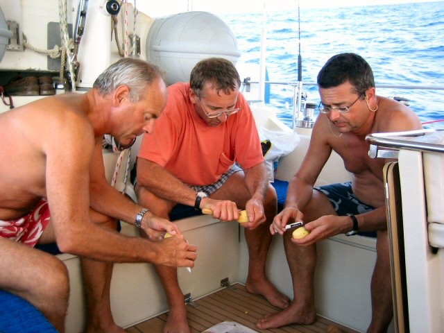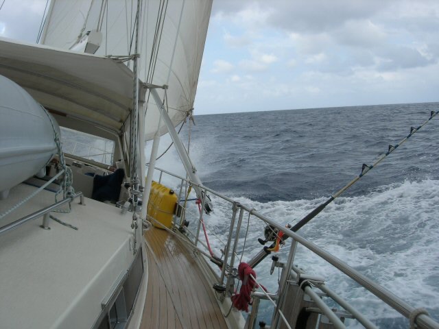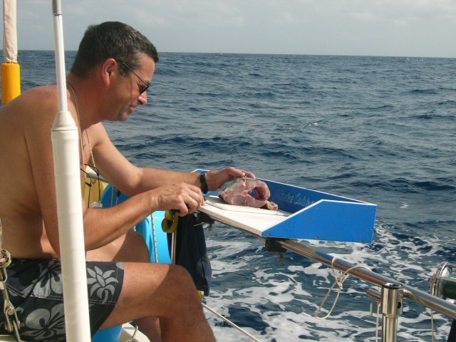 Alain ne pêche plus depuis 4 jours. Nous avançons entre 7 et 9 nœuds ce qui est un peu rapide. Et arrêter le bateau par cette mer agitée peut être dangereux pour l'équilibre du pêcheur tout absorbé à la prise de sa proie. Pas de souci, notre congélateur est encore bien garni. Par contre nous avons achevé nos légumes frais et il ne reste plus que des oranges à la peau dure. Une saine occupation pour les quarts de nuit.