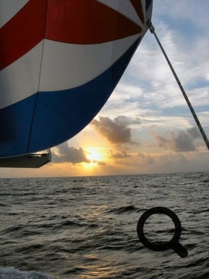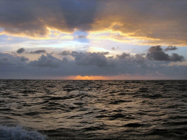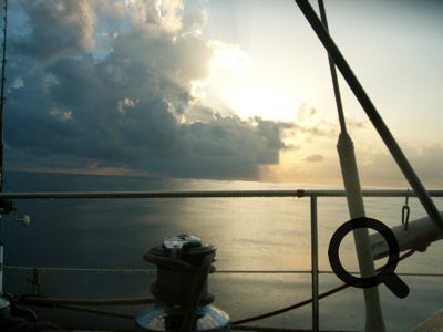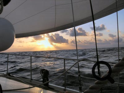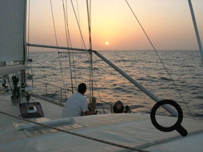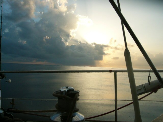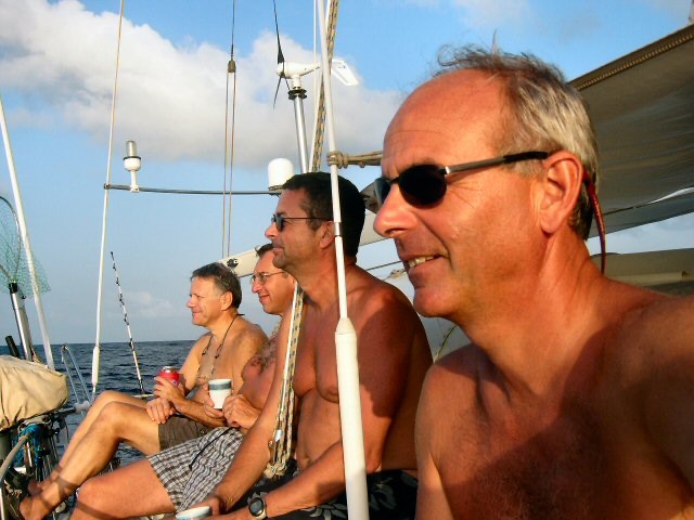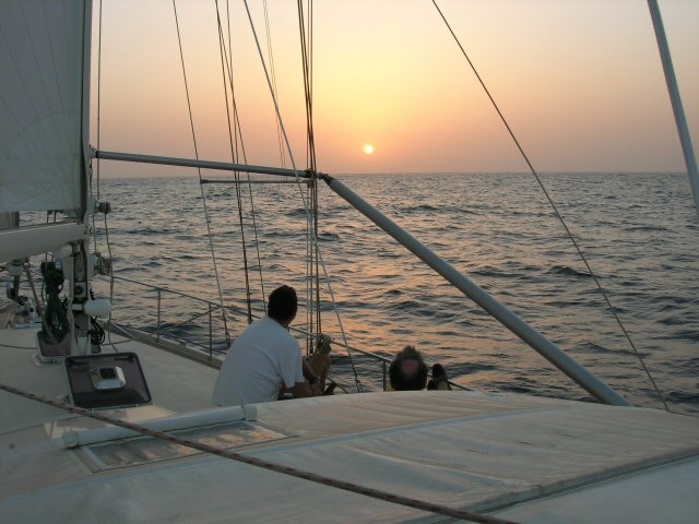En fin de journée, la brise n'est plus qu'une caresse sur l'équipage réuni comme d'habitude à l'arrière pour contempler les aquarelles du soleil couchant sur le blanc des nuages. Moteur !
