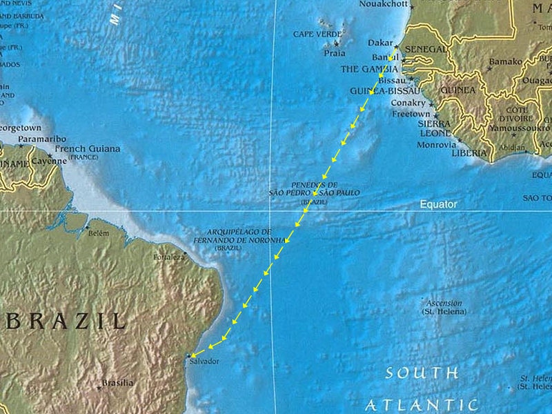 Treize jours et deux heures et 2100 milles ont été nécessaires pour arriver dans la ville de la capoeira. Globalement cette traversée a été plus agréable que la première, car nous étions quatre au lieu de trois. L'entente entre nous a été très bonne. La partie contre le vent a été moins pointue et nous avons collectionné les belles parties de voiles sous toutes les configurations de voilure.
